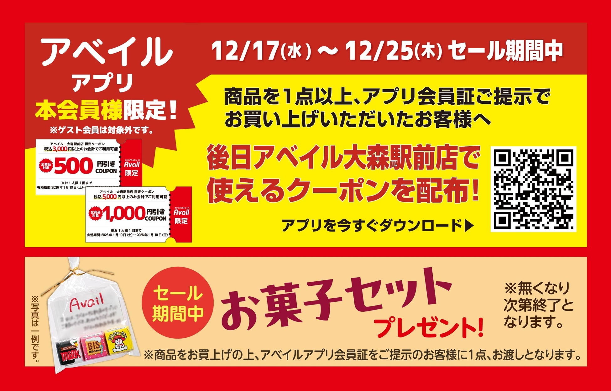12/17(水)~12/25(木)のオープンセール期間中、商品を1点以上お買い上げのうえ、アベイルアプリ会員証をご提示いただいた本会員のお客様に、後日アベイル大森駅前店で使用できるクーポンを配布します。