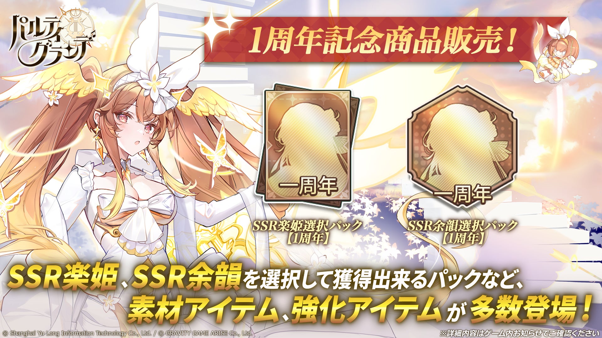 SSR楽姫の中から1体を選んで獲得できる「SSR楽姫選択パック【1周年】」やSSR楽姫の余韻の中から1種類を選んで10個獲得できる「SSR楽姫余韻パック【1周年】」の他、「真愛のティアラ」などが購入できます。