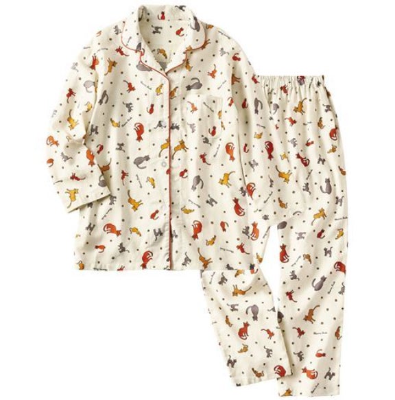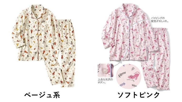 ねこちゃん柄のプリントが心を和ませる綿100%のビエラシャツパジャマです。しっかりとしたハリ感とさらっと軽やかな着心地でロングシーズン快適にご着用いただけます。