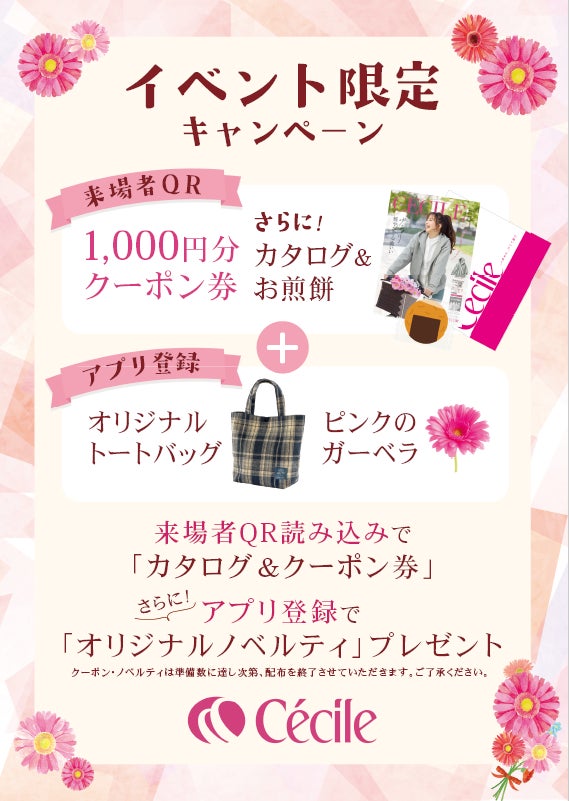 さらにセシールの公式アプリにご登録いただくと、オリジナルトートバッグとピンクのガーベラをプレゼント。来場者向けのサンプリングとして、セシールのチラシを同封し、講演ステージでは当社のCMを上映予定です。会場限定の特典や展示を多数ご用意しています。ぜひこの機会にセシールブースへお越しください。