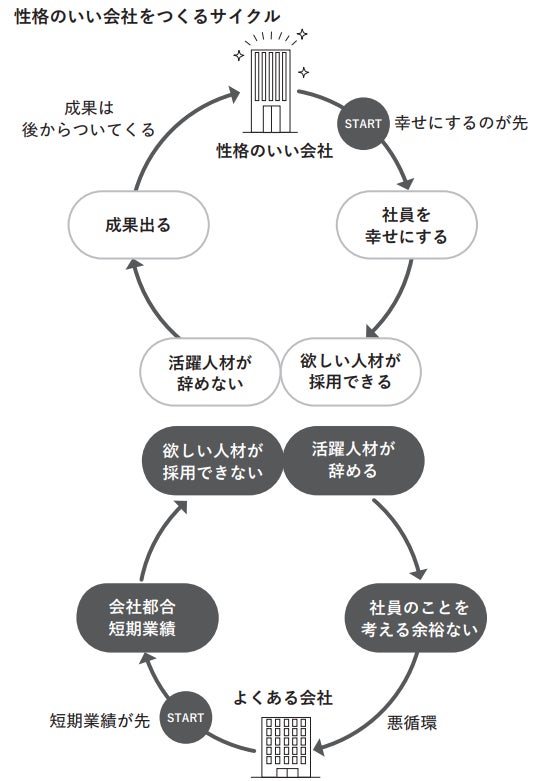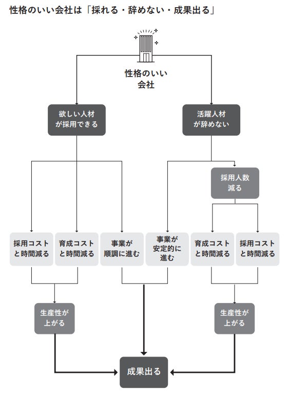 本書でお話しする「性格のいい会社」とは、「社員を幸せにする会社」のことであり、仕事だけでなく、社員のプライベートや家族の時間も大事にする会社です。 著者の佐藤氏は、「性格のいい会社」は目的でなく、手段であり、ゴールではなく、スタートだといいます。