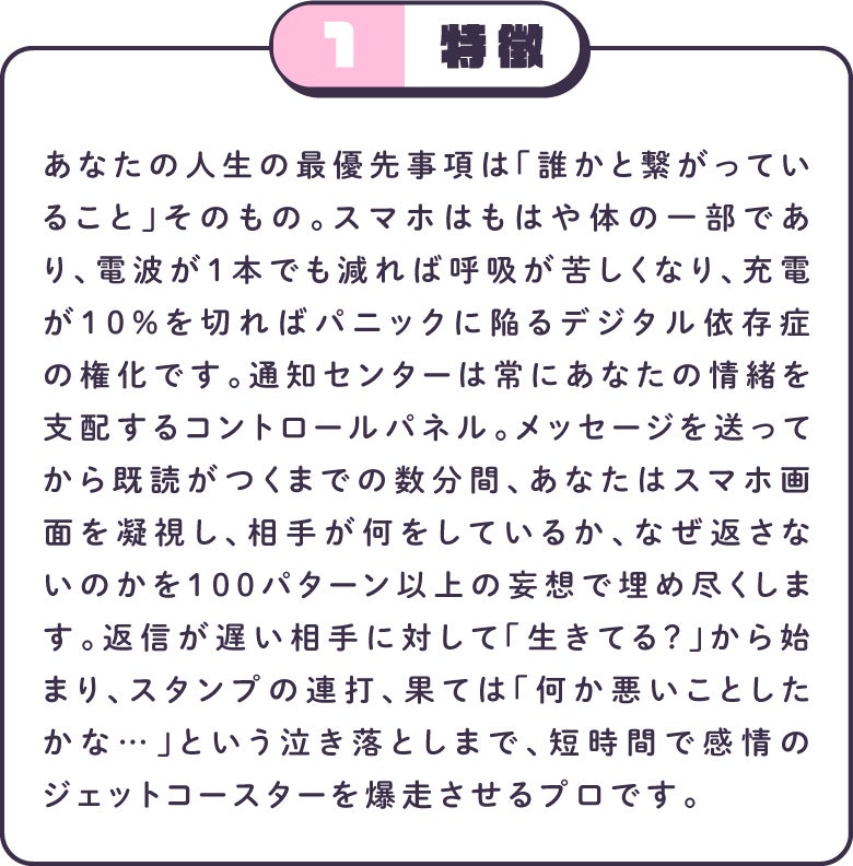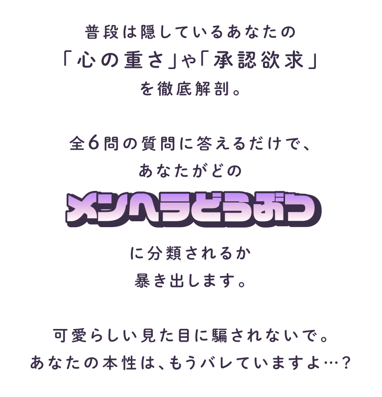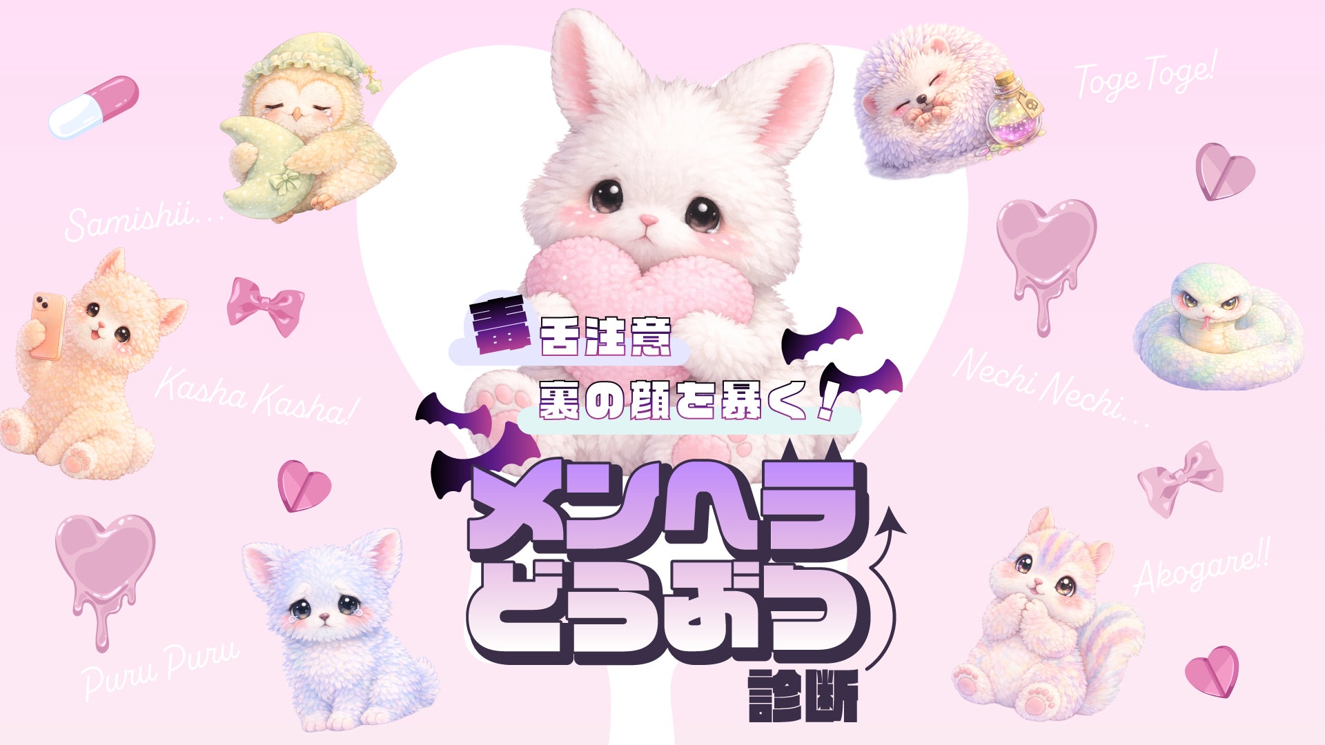本診断は、タイトルに【毒舌注意】を掲げつつ、かわいらしい世界観のビジュアルで没入感を演出。全6問に回答するだけで、普段は隠している「心の重さ」や「承認欲求」を切り口に、あなたがどの『メンヘラどうぶつ』に分類されるかを提示するエンタメ型診断です。