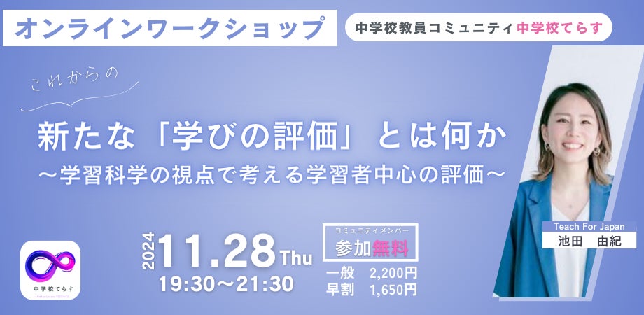 「学びの評価」考えるために、「学習科学」の視点から教師の学びや学習者中心の学びについて研究されているTeach For Japanの池田由紀さんをお招きして、参加者の皆さまと一緒に「学習観・評価観」を言語化したり、「引き起こしたい学びと、それをどのように評価できそうか」ということ」をワークショップ形式で考えていきます。