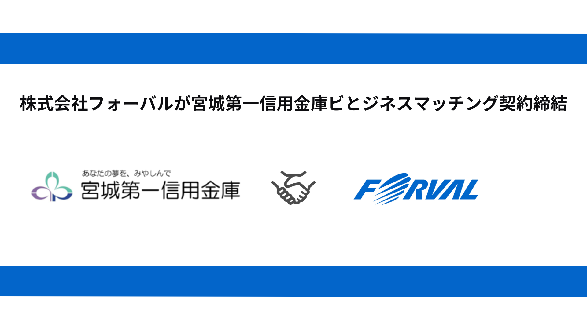 『「新しいあたりまえ」で、新しい世界を創るFORVAL』を理念に掲げ、ESG経営を可視化伴走型で支援する「企業ドクター(次世代経営コンサルタント)集団」の株式会社フォーバル(本社:東京都渋谷区、代表取締役社長:中島 將典、以下「フォーバル」)は、宮城第一信用金庫(本部:宮城県仙台市、理事長:菅原 長男)とビジネスマッチング契約を締結したことをお知らせいたします。