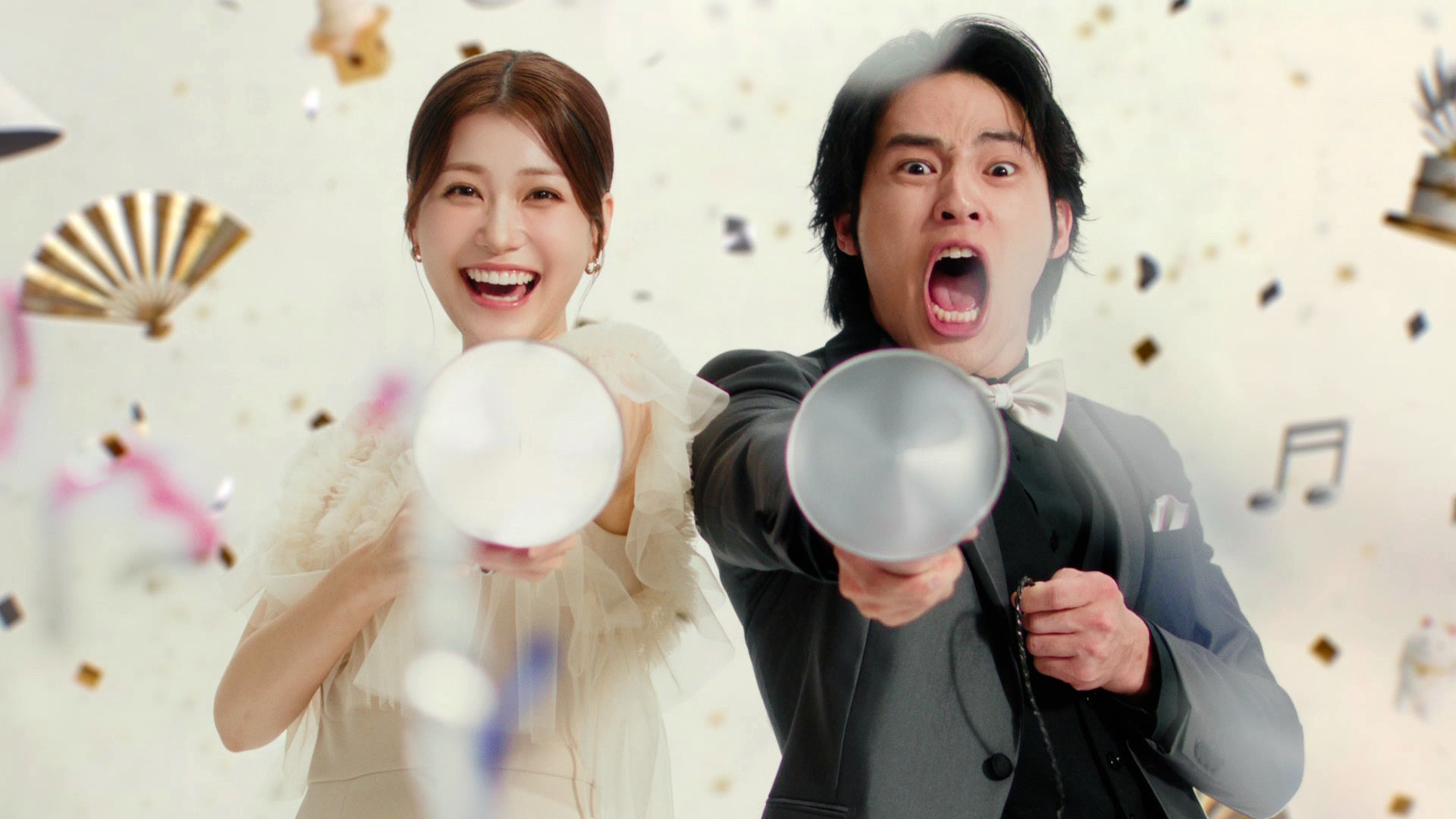 毎年、和の装いで年末年始を彩ってきた新春初売りCMですが、今回は年末年始を祝う『ニューイヤー パーティー』をテーマに、パーティードレスとタキシードに身を包み、ポップで華やかなCMとなりました。アドリブのダンスがメインで構成されており、撮影現場は終始、和気あいあいとした雰囲気で、思わず笑顔になってしまう素敵な映像になっています!