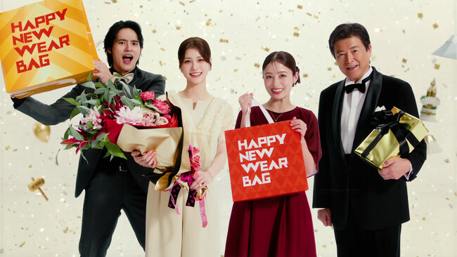 本CMは、橋本さんが赤いパーティードレス、生見さんは白いパーティードレスを着用し、お正月らしい「紅白」の色味を表現。また三浦さんと水上さんは、タキシードを着用し、フォーマルな装いで登場します。4名が声をそろえて「HAPPY NEW WEAR」「HAPPY NEW SUIT」でお祝い。三浦さんと橋本さんがシャンパンで乾杯するシーンや、水上さんと生見さんによる餅つきをイメージした、思わずクスッとする動きを見せるシーンなど、見ているだけで笑顔になれる構成に仕上がりました。なお初売りセールとして店内の特設コーナーでは、スーツ・フォーマルを半額で取りそろえる他、人気ブランドの福袋もご用意します。