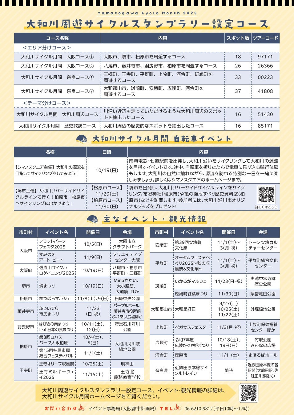 サイクリングをきっかけとして大和川周辺の魅力を感じてもらうことを目的に、9月13日(土曜日)からの約2か月間を「大和川サイクル月間2025」として、各地の魅力的なイベントのご案内とともに、大和川周遊サイクルスタンプラリー2025を開催しております。ぜひ、ご家族やご友人とご参加ください。