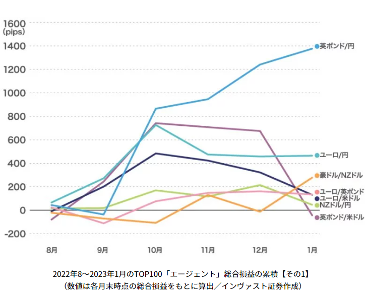 2022年8月~2023年1月のTOP100「エージェント」総合損益では、英ポンド/円がダントツの1位でした。9月以降は右肩上がりに成績を伸ばしています。