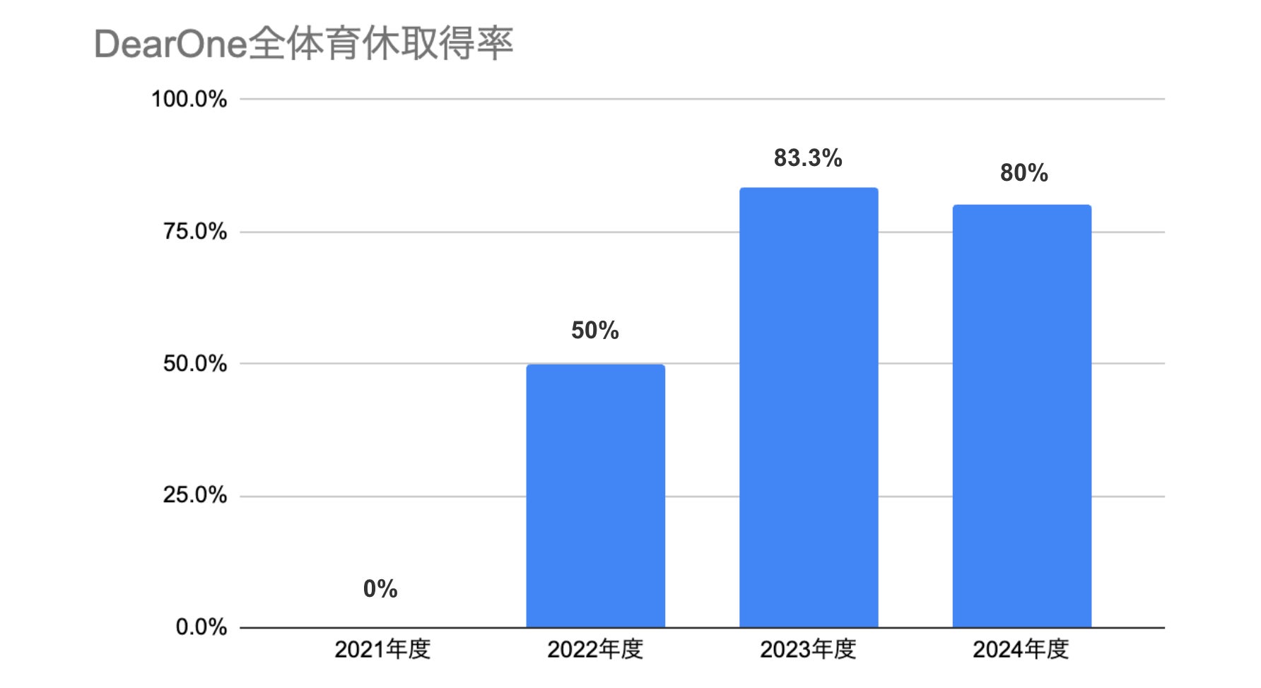 DearOneの育児休業取得率は、多様なメンバーが参画するにつれ段階的に増加し、2023年度・2024年度は共に80%を超えました。