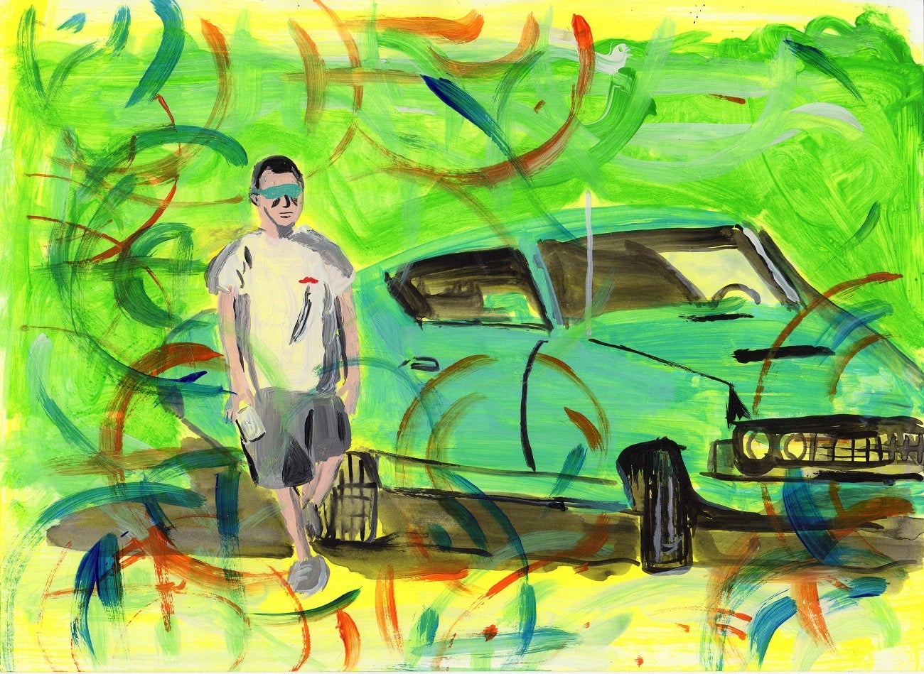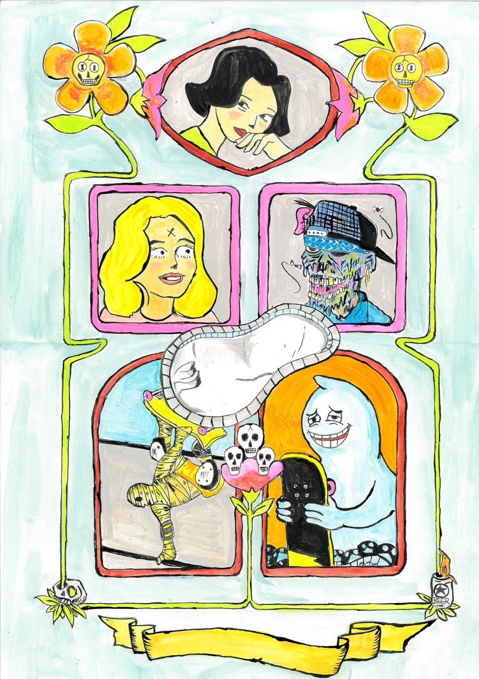 作品のモチーフは、スケートボード.POOL.80sホラー映画.女性等。