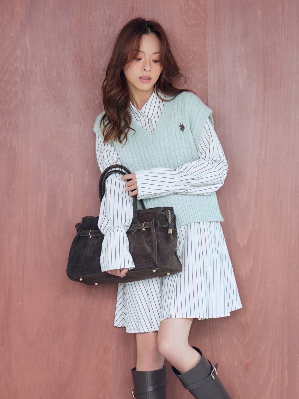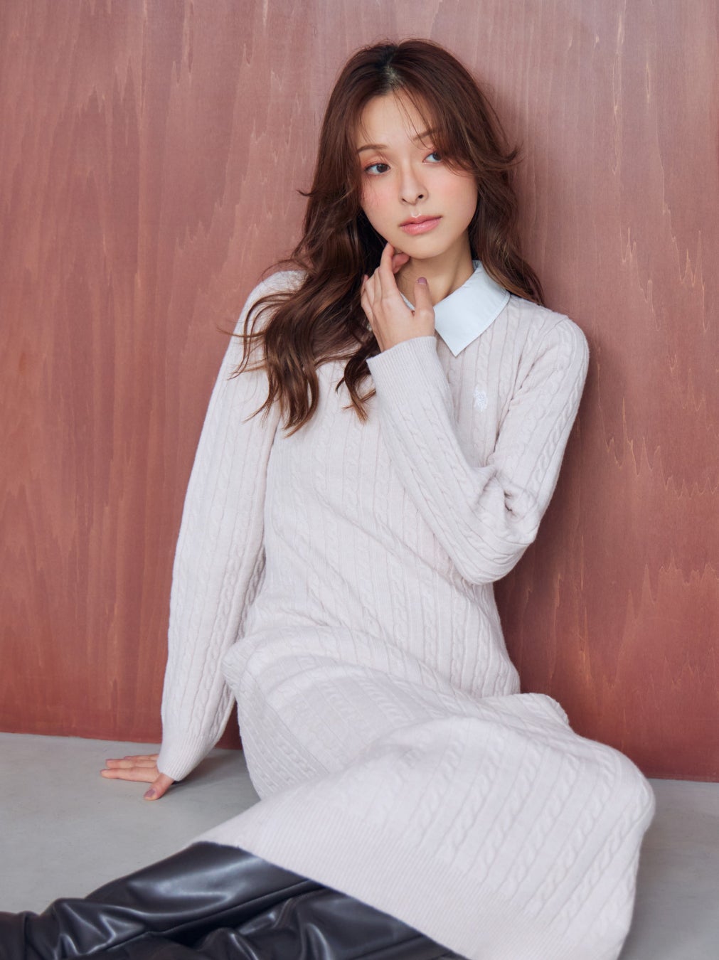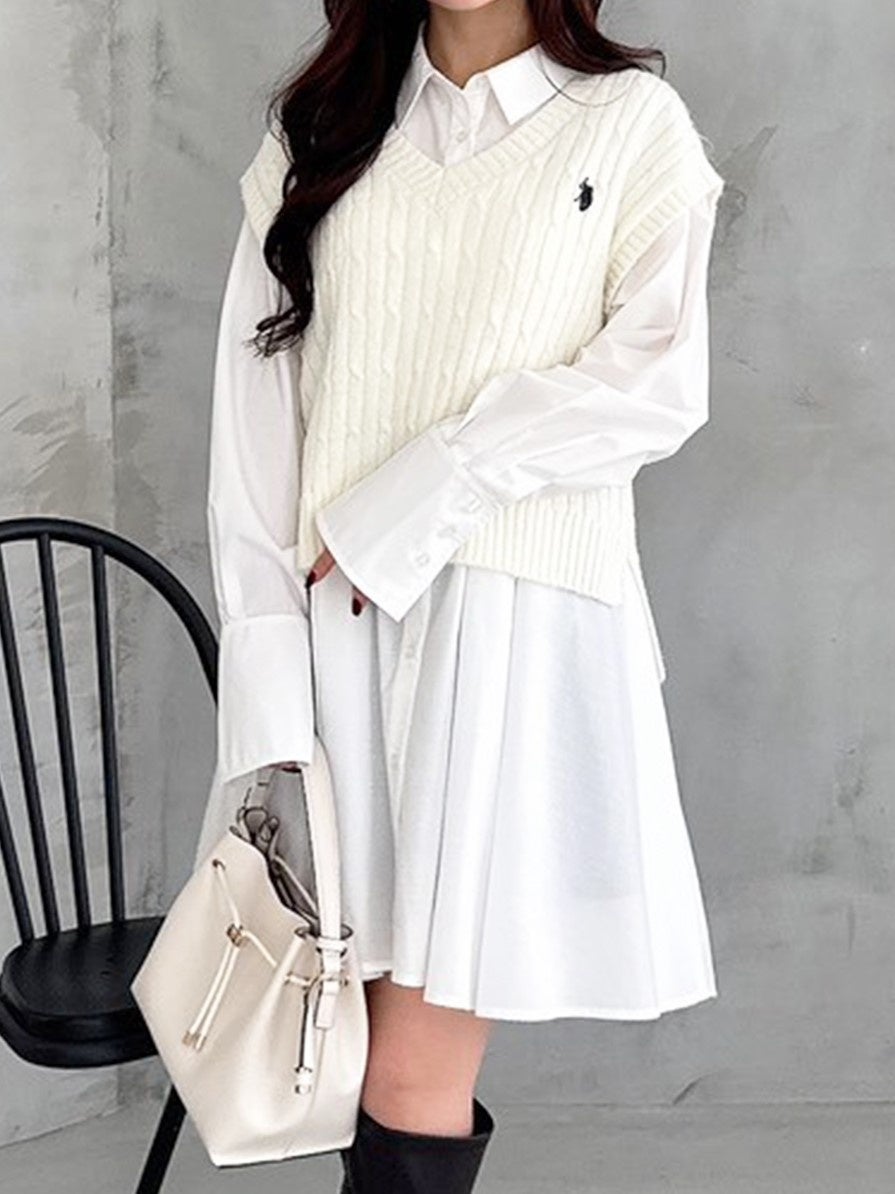 ケーブルニット×シャツの旬なレイヤードが叶うシャツワンピース。ゆったりとしたシャツワンピースにコンパクトなニットベストを重ね、メリハリのあるすっきりとした印象に。