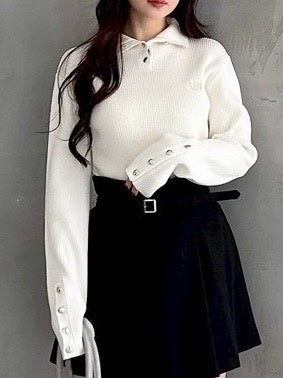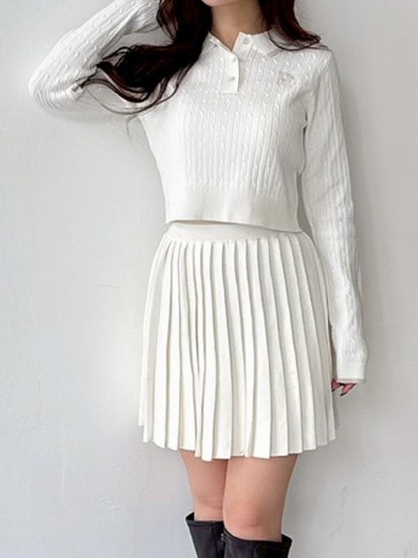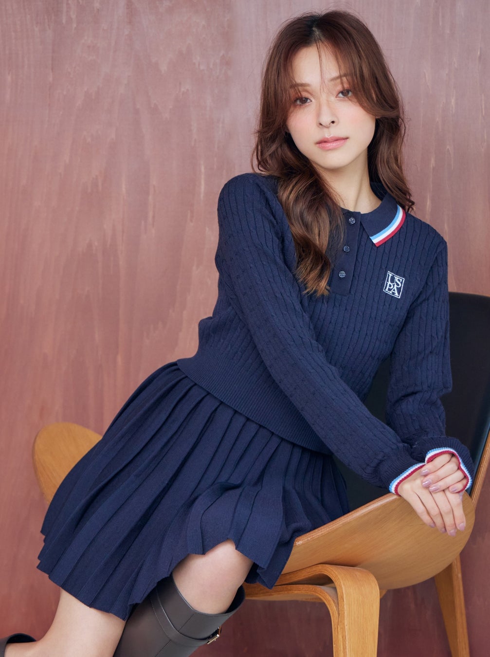 襟元・袖口に施した配色デザイン×プリーツスカートに心ときめくニットセットアップ。きちんと感のあるポロニット風デザインと、「USPA」のボックスロゴがクラシカルなムードを引き立てます。