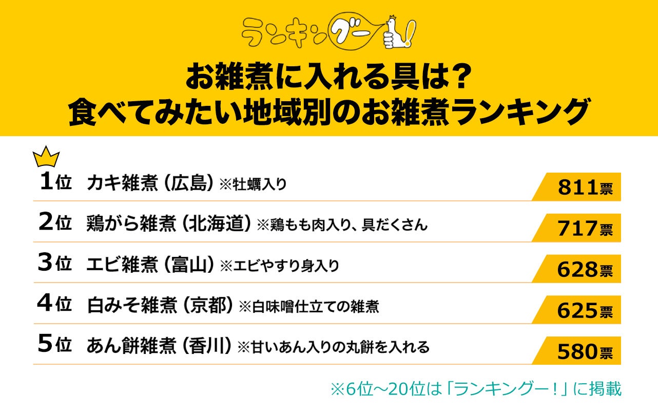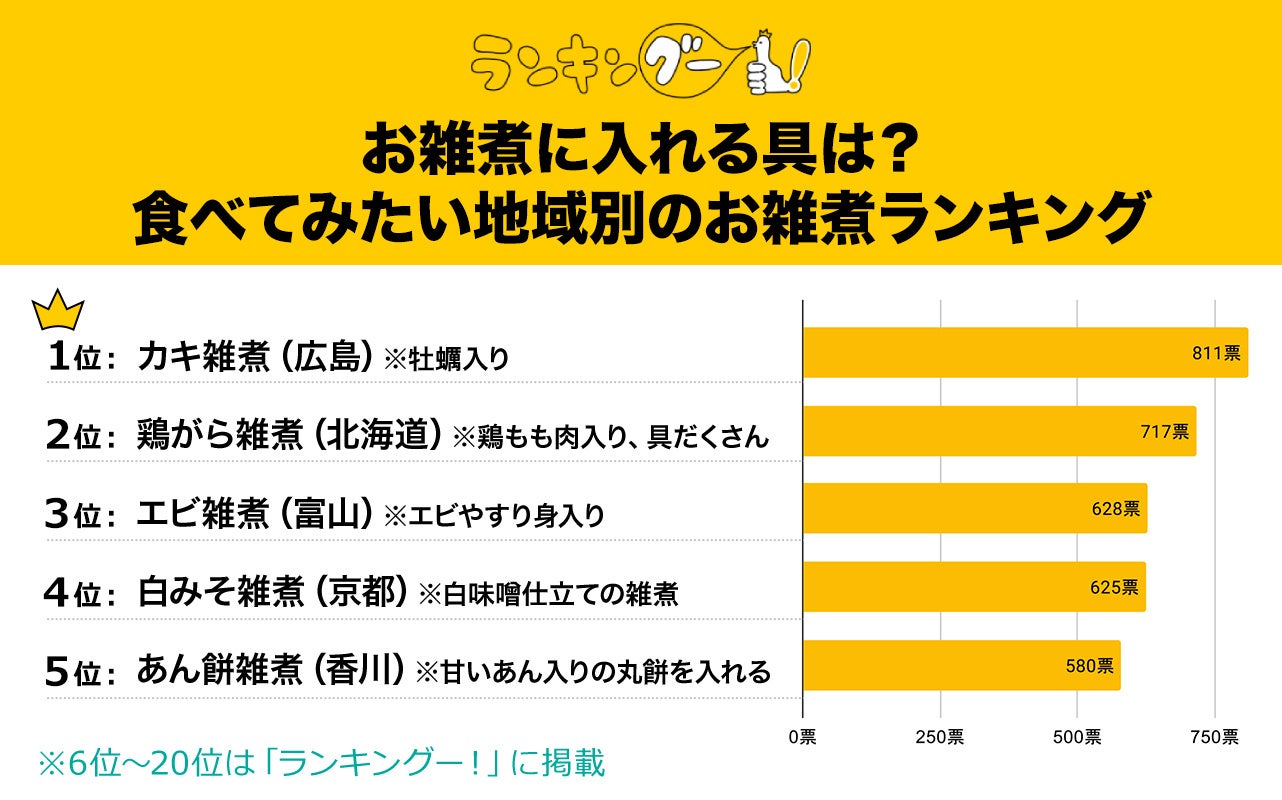 ランキングー!では食べてみたい地域別のお雑煮をピックアップし、ランキングを調査。全年代の男女(性別回答しないを含む)9,490名にアンケートを行い、TOP20を決定しました。ここではTOP5をご紹介します。