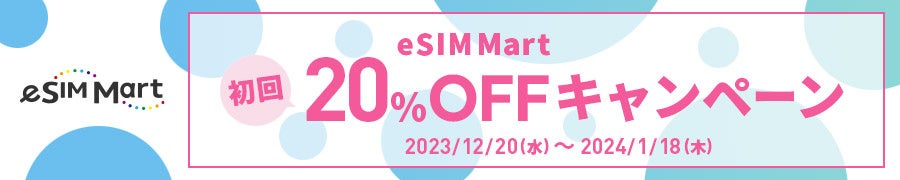 「eSIM Mart」のサイトオープンを記念いたしまして、2023年12月20日(水)~2024年1月18日(木)の期間、eSIM Martで販売しているすべてのeSIM商品を、初回利用に限り20%オフでご利用いただけるキャンペーンを実施いたします。購入画面にて下記クーポンコードを入力すると、自動的に20%割引の料金が適用されます。お一人様1回までご利用いただけますので、ぜひこの機会にeSIMをご利用ください。
