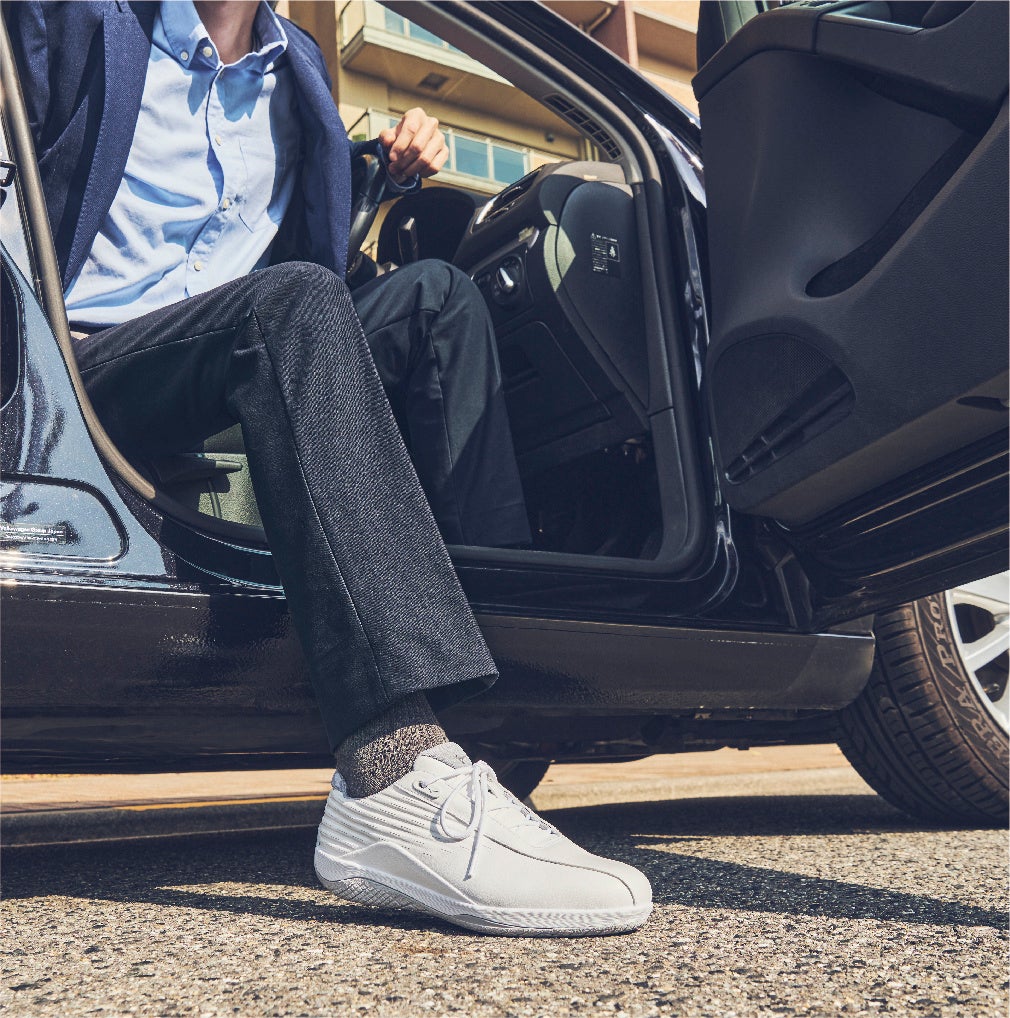 ドライビングシューズ「BARECLUTCH」は、スポーツシューズの知見を生かしながら自動車メーカーと共同開発したソールを採用しています。クルマの運転時に求められる快適なペダル操作性と、日常履きに求められるクッション性などを実現しています。