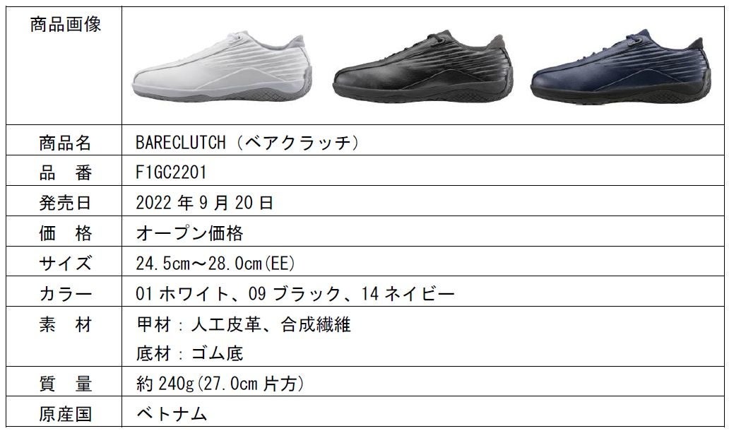 ミズノは、“Drive & Life”をコンセプトに掲げ、クルマの運転操作サポート機能を搭載するドライビングシューズ「BARECLUTCH(ベアクラッチ)」を、ミズノ公式オンライン、一部のミズノ品取扱店で2022年9月20日に発売します。