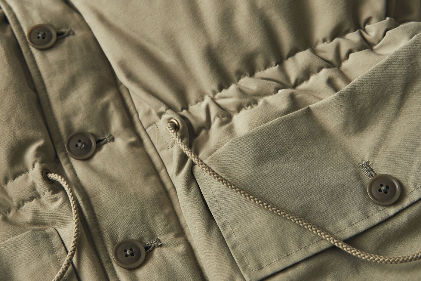 表面の腰部分にはドローコードを装備。 ボリュームのあるダウンジャケットのシルエットバランスを微調整できます。 ギュッと絞ってXラインを演出するなど、さまざまな体型の方も着やすく、こちらもコーディネートをより楽しめるディテールです。