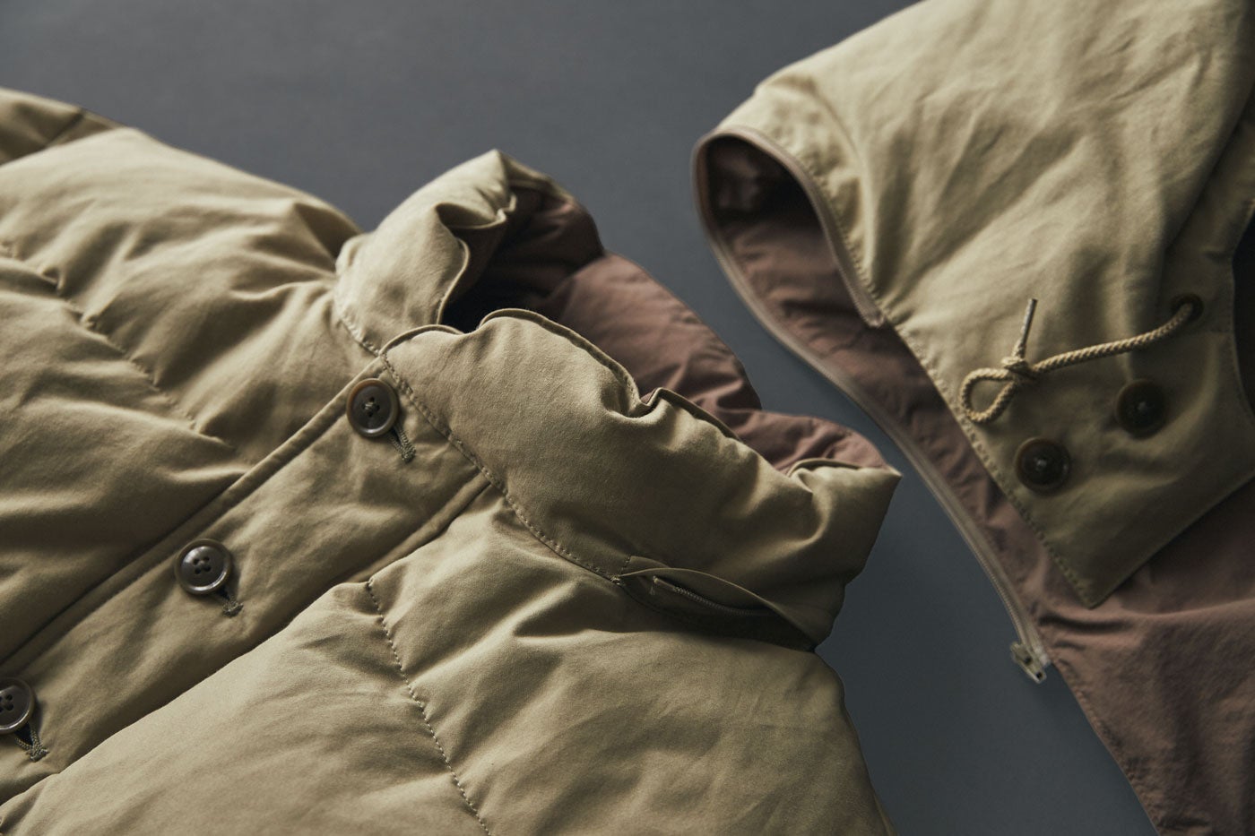 ブリティッシュメイド限定展開の別注ダウンジャケット。こだわったのは、一気に表情が変わる特徴的なリバーシブル仕様。表面はローテク感のあるコットン×ナイロン、裏面はミリタリーライクなリップストップナイロンといった、オーセンティックな風格を持つ生地同士を1着で楽しめます。それぞれインスピレーションを得たのは、表面はクラシックな1960年代のヴィンテージウェア、裏面はブリティッシュアーミー。思わず両面使いたくなる、ヘリテージなルックスが魅力です。
