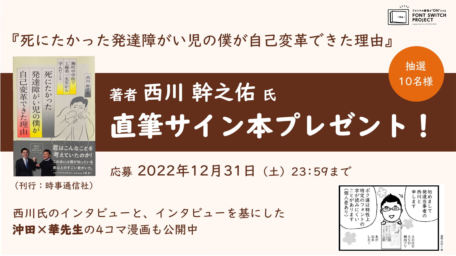 インタビューの公開を記念し、期間中にご応募いただいた方から抽選で10名様に、西川幹之佑氏の書籍『死にたかった発達障がい児の僕が自己変革できた理由』(直筆サイン入り)をプレゼントします。