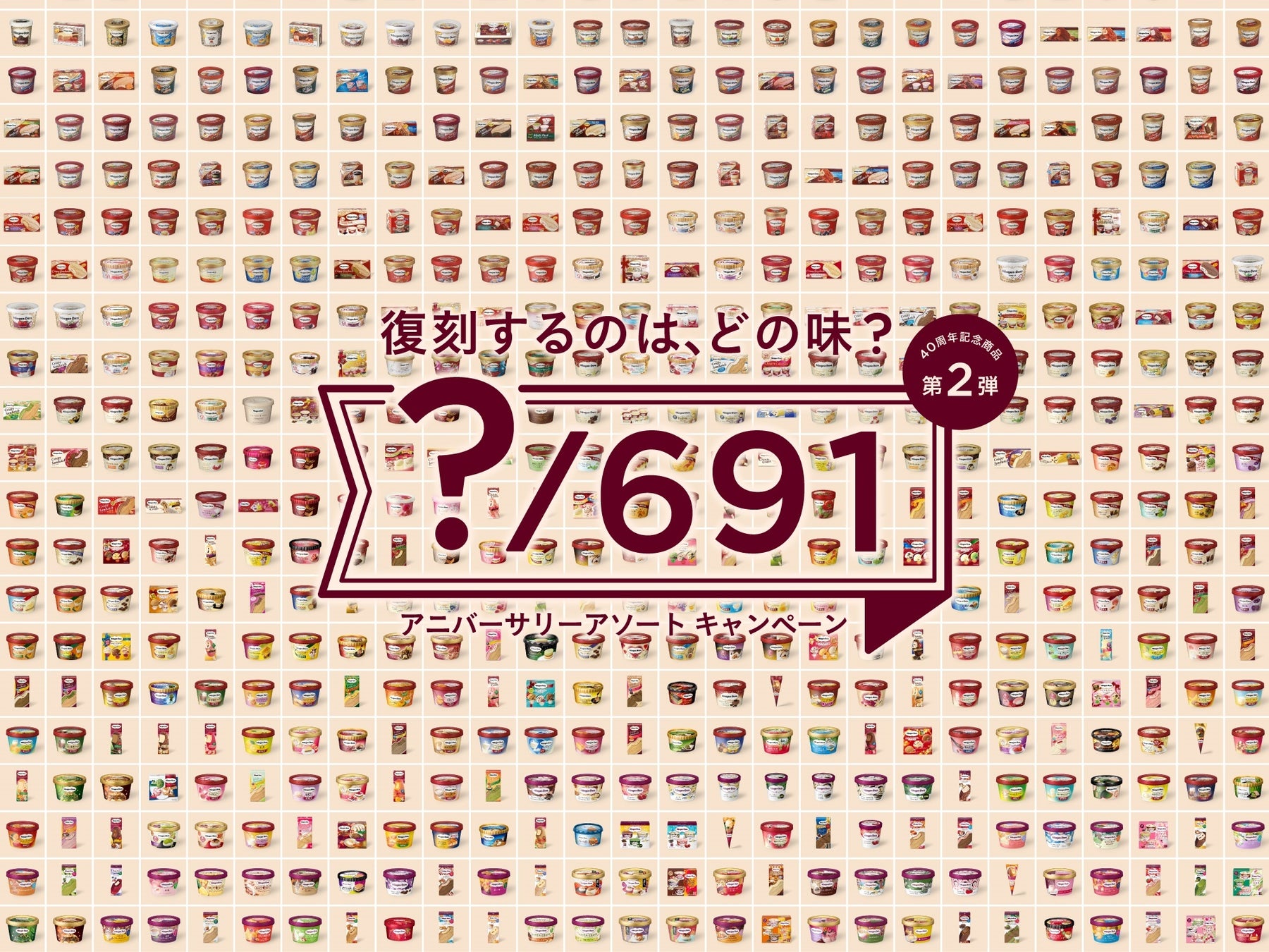 ハーゲンダッツ ジャパンは、40年に渡る歴史の中で「691種類」のフレーバーを展開してまいりました。今回、アソートボックス『アニバーサリー アソート』として復活するのは、たった3種類のフレーバーだけです。そこで、691種類のフレーバー画像やフレーバー名一覧から復活する3種類を予想いただくキャンペーンを、ハーゲンダッツ ジャパン公式Xで実施します。ぜひヒント画像から、復活するフレーバーを予想してください。