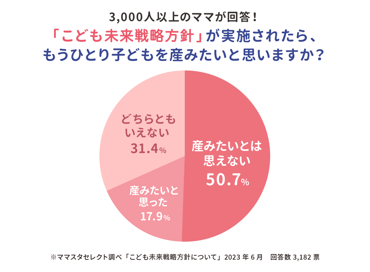 2023年6月、政府が少子化対策の一環として「こども未来戦略方針」を閣議決定したのを受けて、ママスタセレクトでは「”こども未来戦略方針”が実施されたら、もうひとり子どもを産みたいと思いますか?」というアンケートを実施。「産みたいと思う」「産みたいとは思えない」「どちらともいえない」の選択肢を設定したところ、3,100人を超える回答が集まりました。