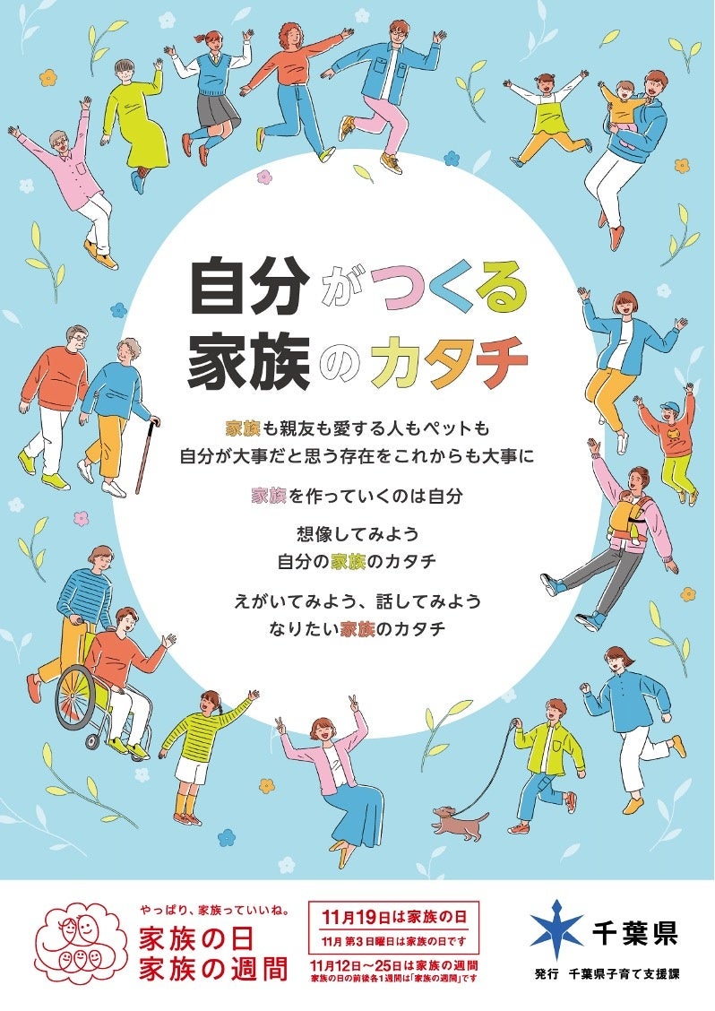 本ポスター・チラシは千葉県全体で結婚・子育て等を応援する機運を醸成するため、家族や地域の大切さ等についての理解促進や、若い世代の結婚、子育てを応援する機運の醸成を図る国の取組(11月第3日曜日「家族の日」、前後1週間の「家族の週間」)を令和5年度に市町村と連携して行うため制作いたしました。