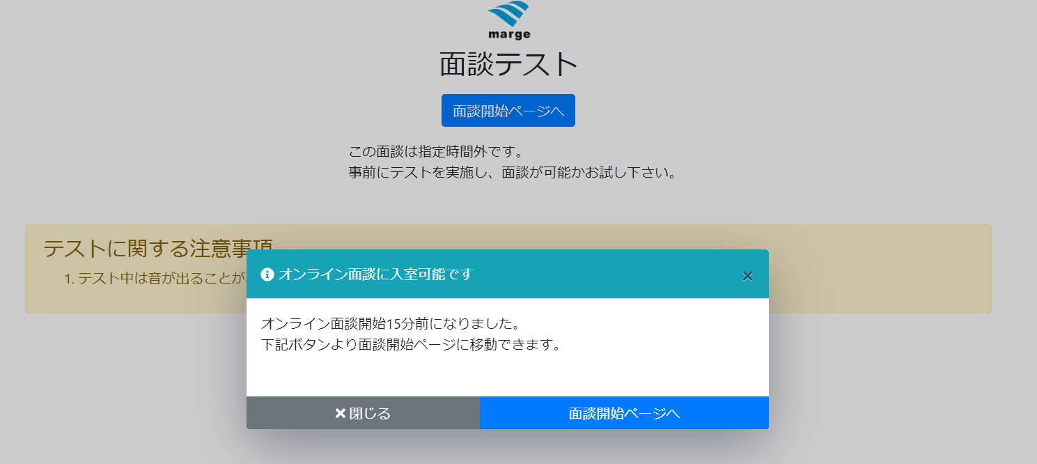 また15分以上前に入室すると通信環境(マイク・カメラなど)をチェック出来るテストページに遷移し、15分前になると下記のようなオンライン面談へ入室可能との案内ウィンドウが表示されます。