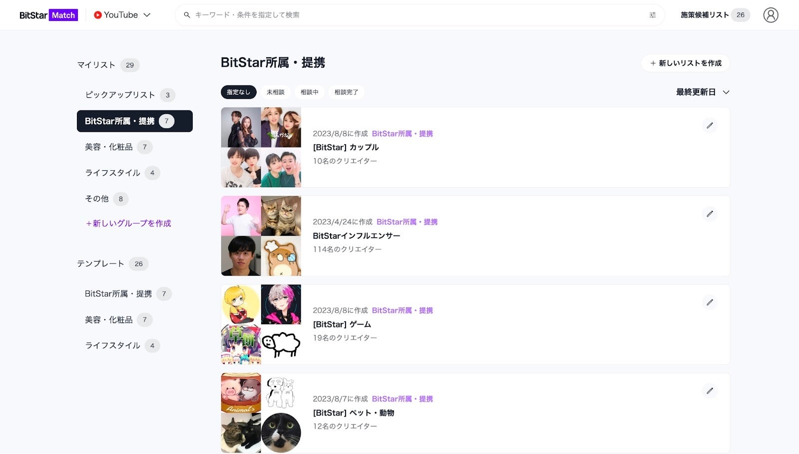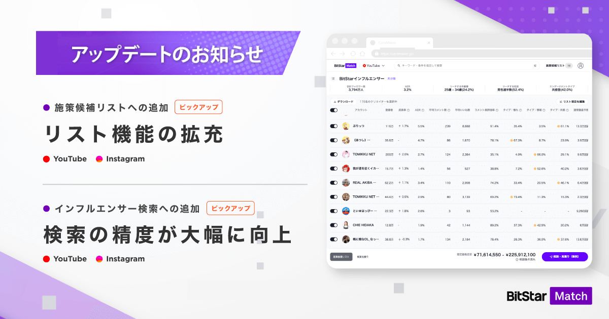 インフルエンサーマーケティングプラットフォーム「BitStar Match」、無料プランを大幅アップデート。インフルエンサーリスト機能の拡充や、インフルエンサー検索の精度が大幅に向上