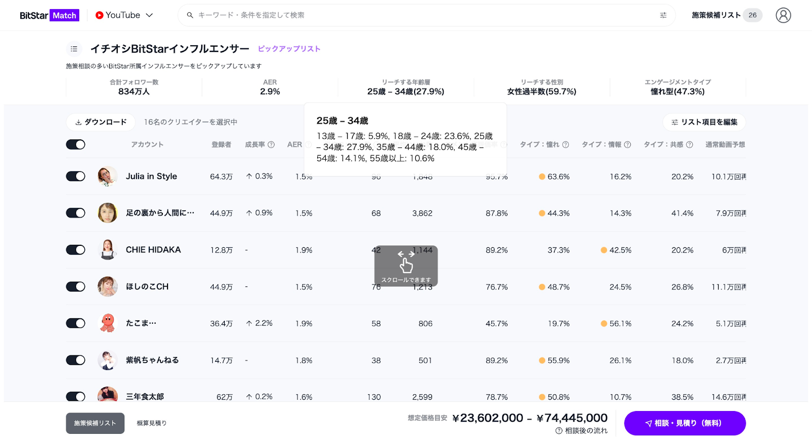 「BitStar Match」では、企業のマーケティング担当者自らが商品やサービスにマッチしたインフルエンサーを簡単に探すことができます。YouTube・Instagramにて30万人以上のデータベースから、タイアップ実績・フォロワー数・想定単価・視聴者の性年代などのフィルタリングをかけて、候補となるインフルエンサーを絞り込むことが可能です。