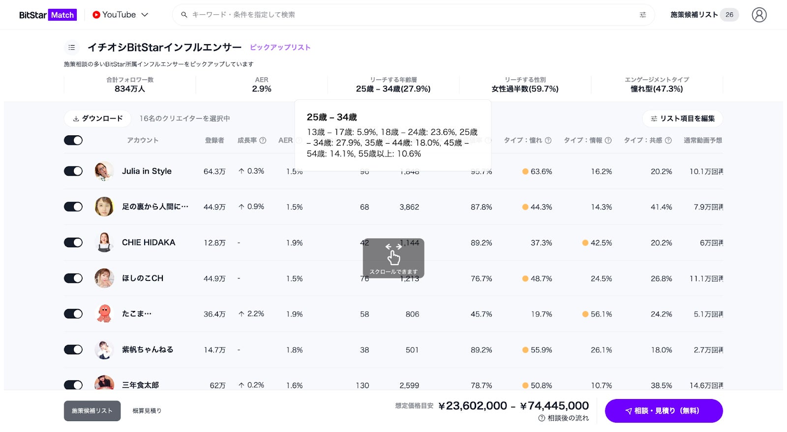 ※無料プランでのインフルエンサー選びでは料金は発生いたしません。BitStarへの施策相談・発注以降、起用クリエイターの制作費用を含む料金をいただきます。