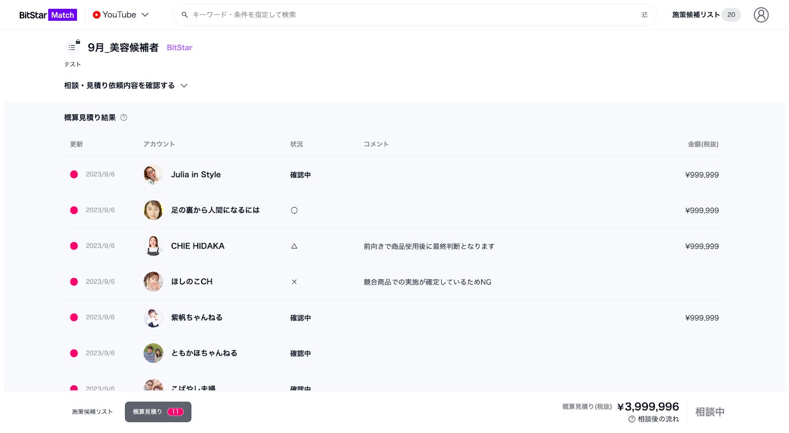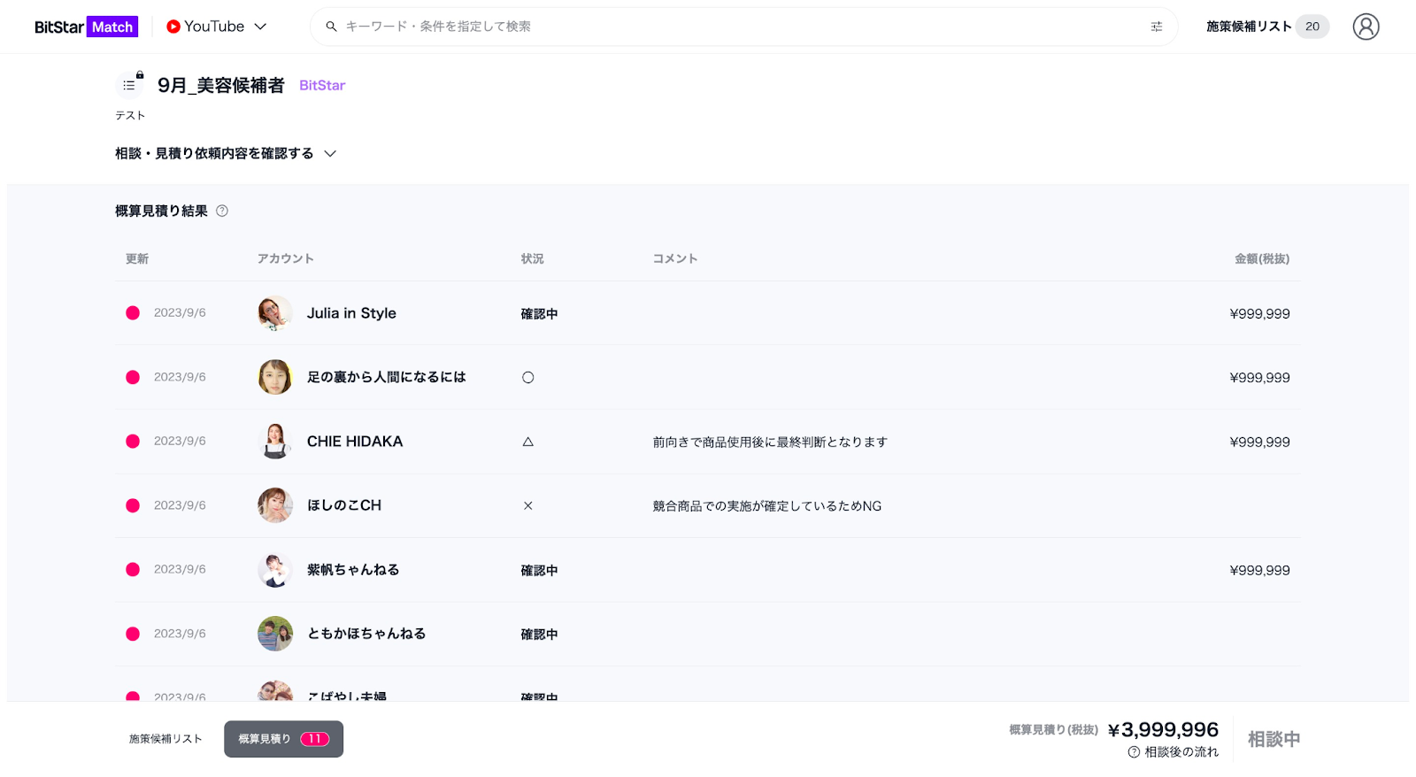 作成したインフルエンサーリストから、タイアップ施策を実施した場合の概算見積りおよびインフルエンサーの実施可否確認をボタンひとつで依頼いただくことが可能となりました。インフルエンサー毎での確認状況や発注金額をBitStar Match内で管理でき、インフルエンサーの発見から発注までをBitStar Match内でよりスムーズに進めていただけます。