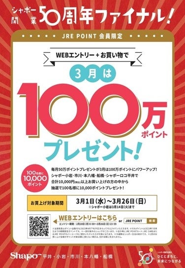 2023年3月1日(水)~3月26日(日)の期間中WEBエントリーの上、シャポー小岩・市川・本八幡・船橋・シャポーロコ平井で合計10,000円(税込)以上お買い上げいただいた方の中から抽選で100名様にJRE POINT10,000ポイントをプレゼントいたします。