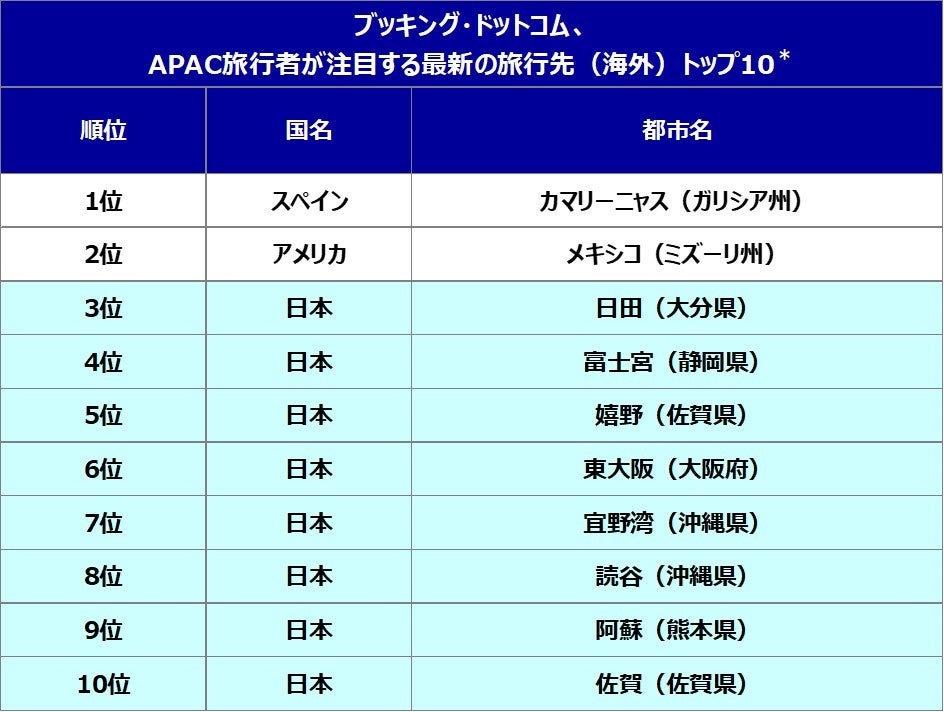 「すべての人に、世界をより身近に体験できる自由を」を企業理念に、多種多様な宿泊施設や旅ナカ体験、旅行中のシームレスな移動手段を提供する世界最大級の宿泊予約サイト Booking.com は、アジア太平洋地域(以下、APAC)の旅行者によるBooking.comの検索データ*をもとに、APAC旅行者が注目する最新の旅行先(海外)10選を発表いたします。