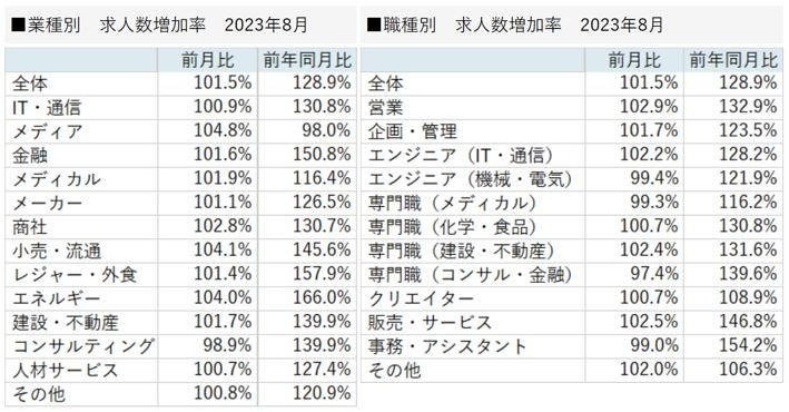 求人数は、業種別では12業種(「その他」は除外)のうち11業種で前月から増加しました。最も増加率が大きかったのは「メディア」(前月比104.8%)、次いで「小売・流通」(前月比104.1%)でした。職種別では11職種(「その他」は除外)のうち7職種で前月から増加し、増加率が最も大きかったのは「営業」(前月比102.9%)、次いで「販売・サービス」(前月比102.5%)となりました。
