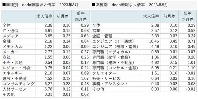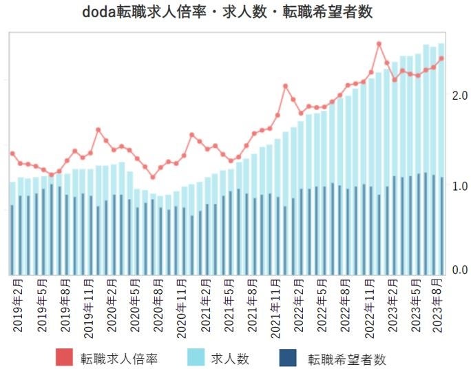 doda転職求人倍率 2023年8月は2.38倍(前月差+0.10ポイント)