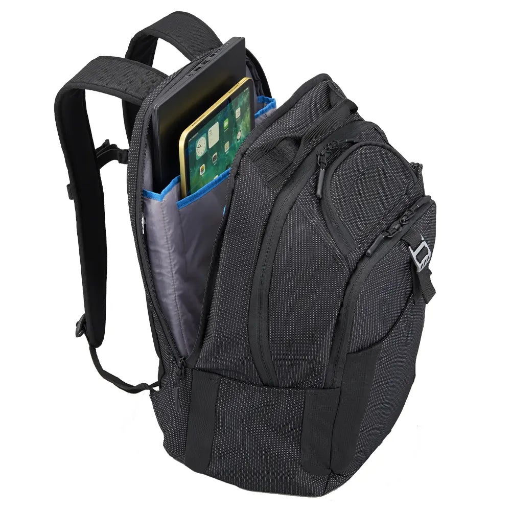 THULEのバッグを象徴する耐衝撃SafeZoneポケットは、アイウェアやスマートフォンを直接入れるだけで衝撃から守れるセミハード成形のため、すばやく出し入れできるのが魅⼒。SafeEdege構造のノートPCポケットはバッグを床に置く衝撃を直に伝えず、縁まで厚⼿のパッドでしっかり守るため、移動の多いときでも安心です。優れたプロテクションとすばやいアクセス性で、アクティブな人の移動を快適にサポートします。