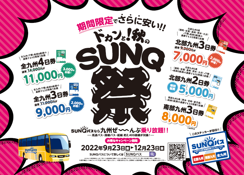九州・山口の47のバス・船舶事業者が加盟するSUNQパス運営委員会(事務局:西日本鉄道株式会社、運営委員長:宮﨑泰)では、2022年9月23日から12月23日までの期間、「ドカンと!秋のSUNQ祭」キャンペーンを実施します。