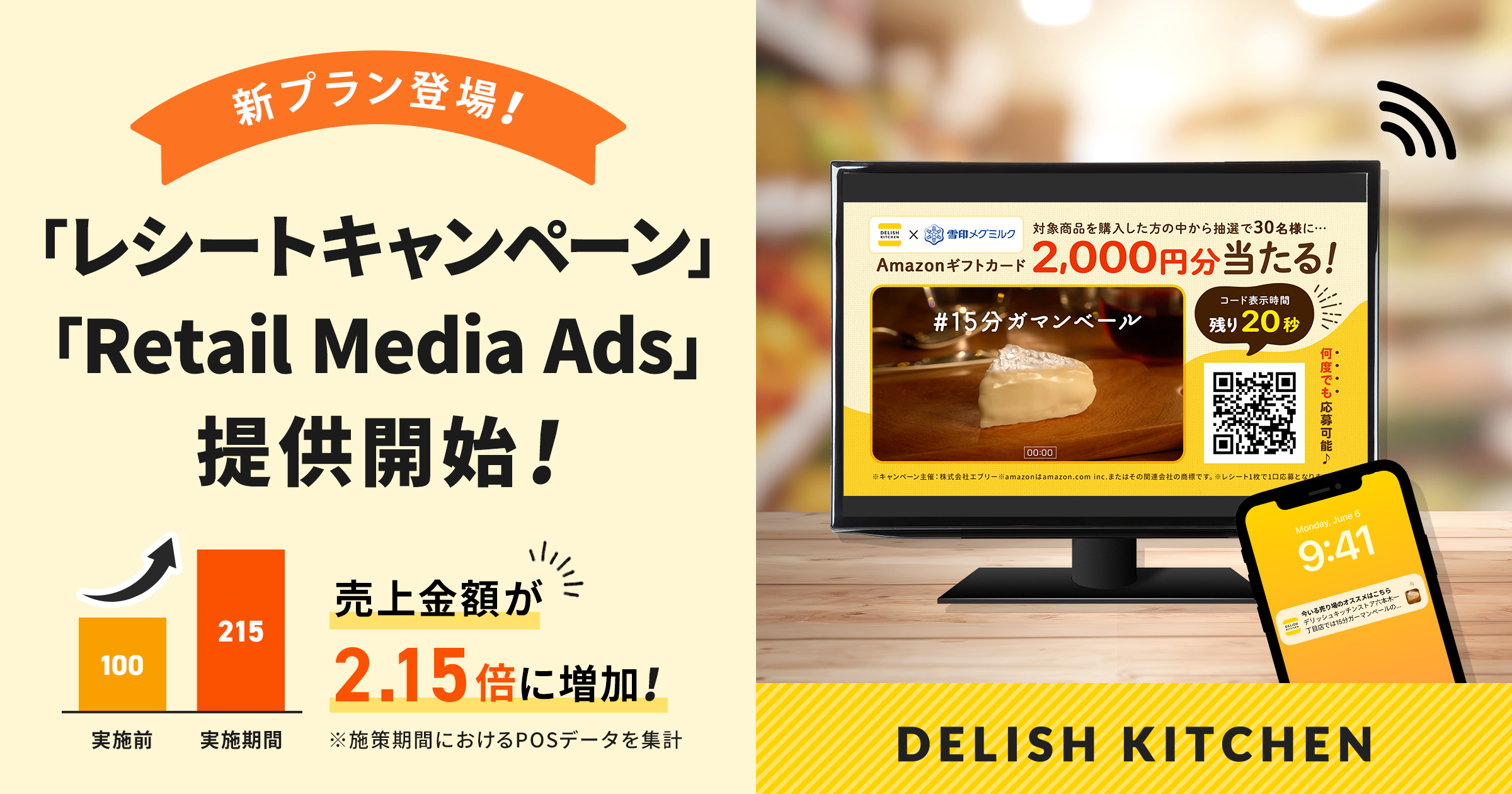 株式会社エブリー(本社:東京都港区、代表取締役:吉田 大成)が運営する『DELISH KITCHEN』は、スーパーマーケットの店頭サイネージで、レシピ動画を活用した広告配信ができるプラットフォーム「ストアビジョン」を運営しています。この度、「ストアビジョン」を活用して購買を後押しする「レシートキャンペーン」と、エブリーが保有するデータを活用し様々なプラットフォームへ広告配信、効果検証ができる「Retail Media Ads」を開始いたします。