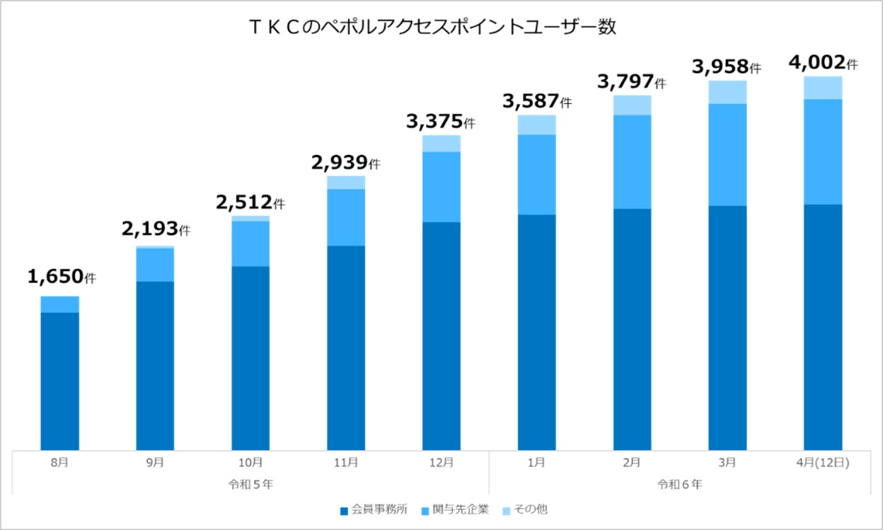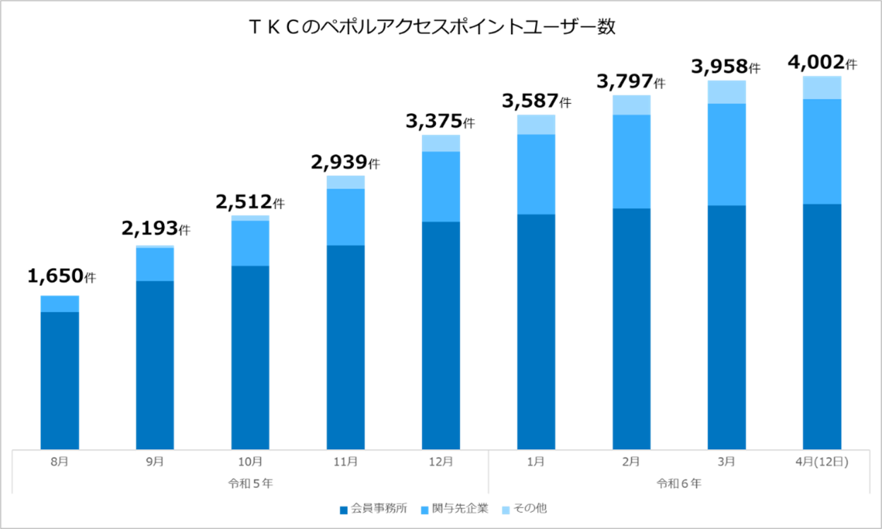 本年4月11日に、TKCのペポルアクセスポイントのユーザー数が4,000件を突破しました。これまでの推移は、以下のグラフのとおりです。