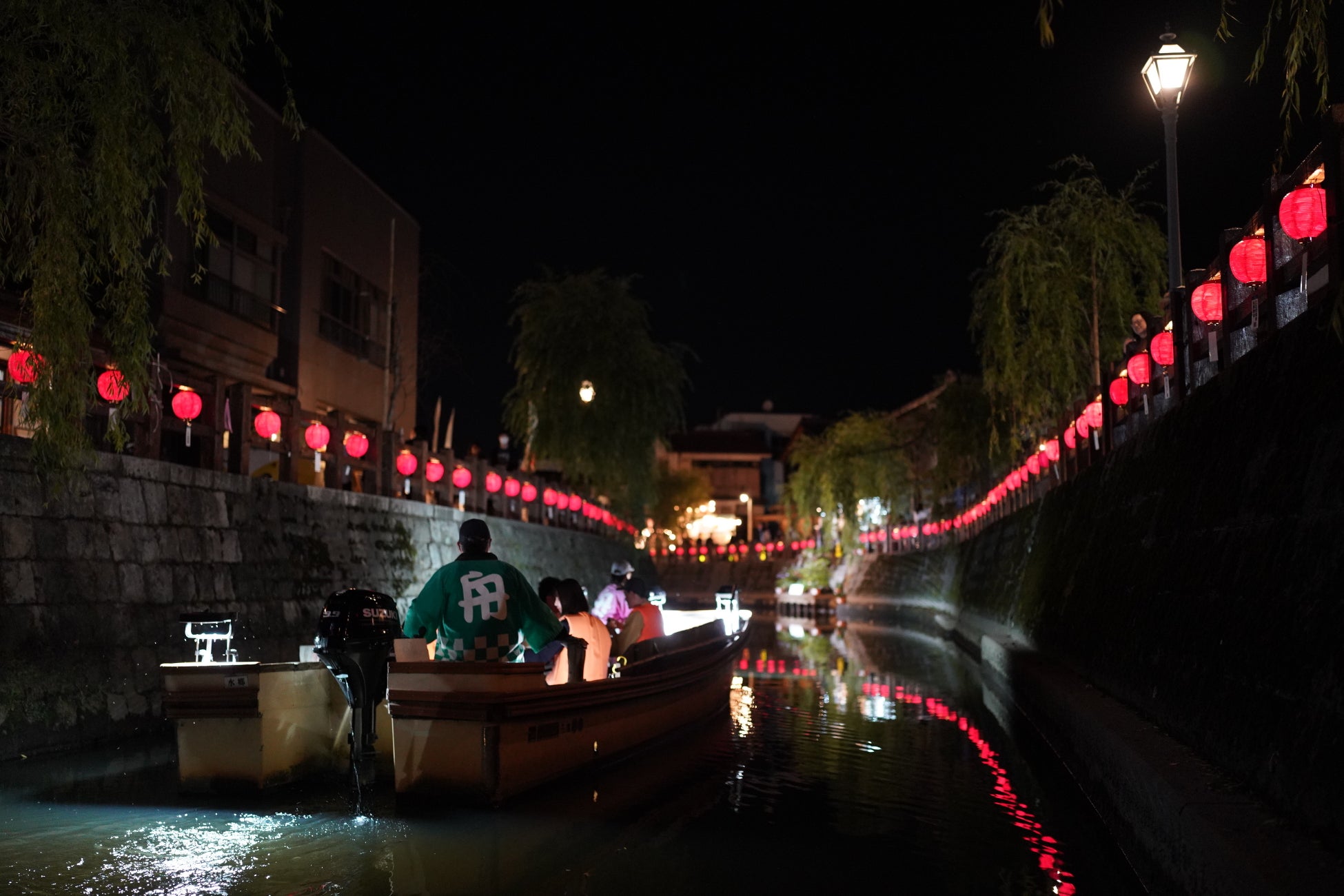 夜の小野川で舟に揺られながら晩酌や月見を満喫できるほか、普段とは違った目線からまちの表情をご覧いただけます。まるで江戸時代にタイムスリップしたような非日常の体験をお愉しみください。