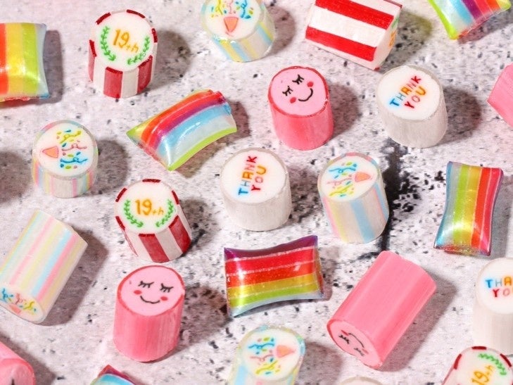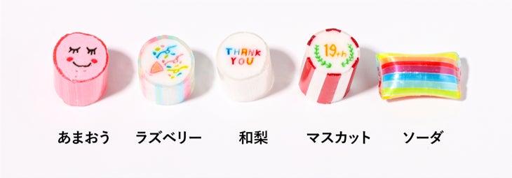 19周年の感謝をテーマにしたプレミアムキャンディミックスです。「ありがとう」とお辞儀をしているようなにっこりとした表情、感謝の気持ちを込めたthank youの文字、そしてクラッカーと19thの文字を入れた、まるでパーティーのようなカラフルで華やかなデザインに仕上げました。あまおうや和梨の限定フレーバーも入っており、特別感もプラスしています。