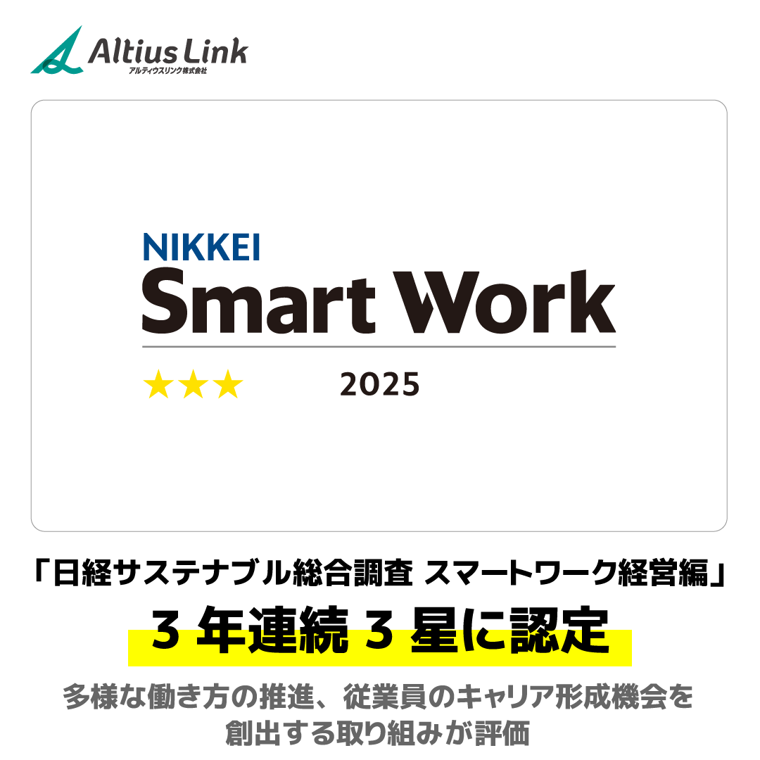 アルティウスリンク株式会社(所在地:東京都渋谷区、代表取締役社長:網野 孝、以下 アルティウスリンク)は、人材を最大限に活用するとともに、人材投資を加速させることで新たなイノベーションを生み出し、生産性を向上し、企業価値を最大化させることを目指す先進企業を選定する「日経サステナブル総合調査 スマートワーク経営編」において、3年連続で3星に認定されました。