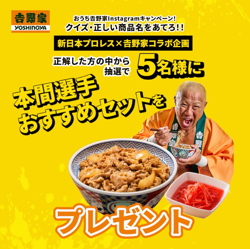 Instagram公式アカウント「おうち吉野家」 (@yoshinoya_co_jp)で本間選手があるクイズを出題する動画を公開します。本間選手のクイズに正解した方の中から抽選で5名様に『これが本間の牛丼じゃ~!セット』をプレゼントします。公式アカウントをフォローして、クイズの答えを投稿すれば、どなたでも応募できます。