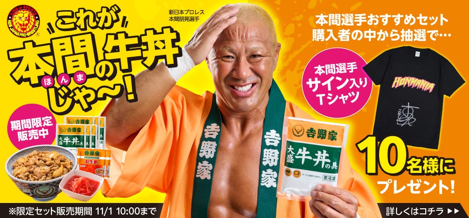株式会社吉野家(本社:東京都中央区 代表取締役社長 河村泰貴、以下吉野家)は、10月1日(火)10時から11月1日(金)10時の期間、新日本プロレスに所属する本間朋晃選手とコラボレーションを実施し、「吉野家公式通販ショップ」やInstagram公式アカウント「おうち吉野家」 (@yoshinoya_co_jp)で施策を展開します。