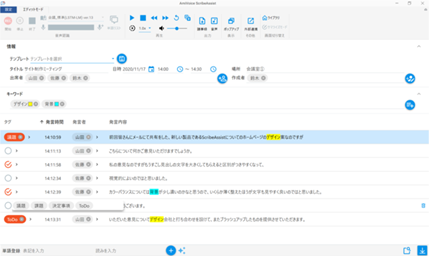 「重要」「決定事項」「TODO」などワンクリックでタグ付けや、設定したキーワードをハイライトします。また、簡単な操作で検索ワードやタグ、発言者で抽出・出力などが可能です。