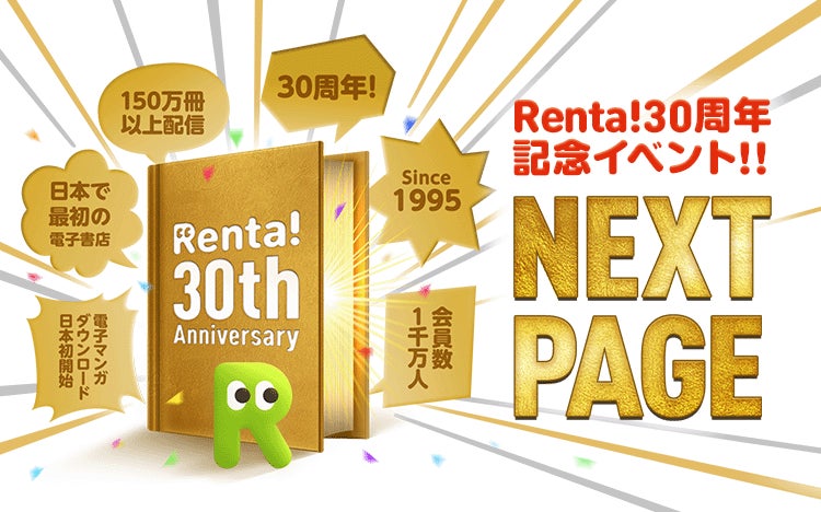 このたび「Renta!」では、Renta!30周年記念特別イベント「NEXT PAGE」を開催しました!電子書店の過去・現在・未来を楽しんでいただけるよう様々な企画を展開しております。また、お得なキャンペーンも実施しておりますので、これを機に「Renta!」を存分にお楽しみください♪