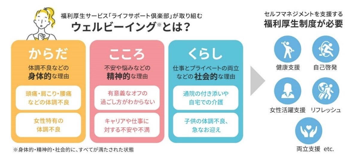 [https://w7.lifesc.com/]リソルライフサポートが企画運営する『ライフサポート倶楽部』は、企業・団体の個々のニーズを捉えた多彩なサービスメニューを取り揃え、働く人々のウェルビーイングを実現し、安心して働き続けることができる環境づくりをサポートする福利厚生サービスです。リソルグループの宿泊施設・ゴルフ場をはじめ、全国提携の宿泊施設、スポーツクラブ、レジャー施設、育児・教育・健康・介護などの生活に役立つサービスメニューを会員優待料金で提供しています。