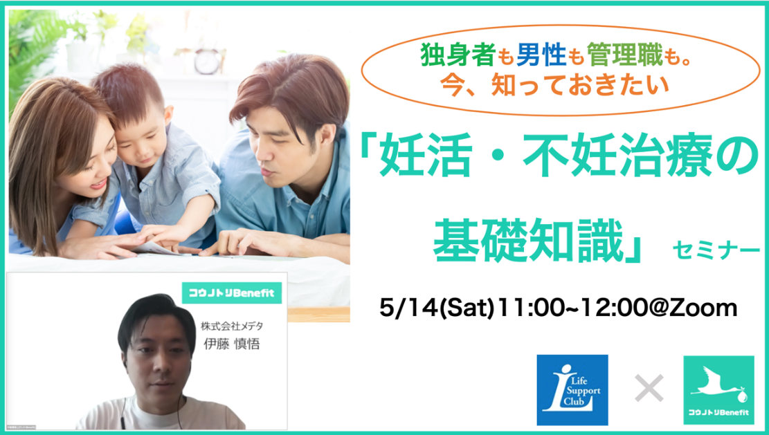 福利厚生サービス『ライフサポート倶楽部』を展開しているリソルライフサポート株式会社(本社:東京都中央区 代表取締役社長:馬場 大典、リソルホールディングスのグループ会社、以下「リソルライフサポート」)と妊活・不妊治療と仕事の両立を支援する福利厚生サービス「コウノトリBenefit」を運営する株式会社メデタ (本社:東京都中央区、代表取締役:伊藤 慎悟、以下「メデタ」)は、2022年5月14日(土)に『ライフサポート倶楽部』会員を対象とした「妊活・不妊治療基礎知識セミナー」をオンラインで開催いたしました。