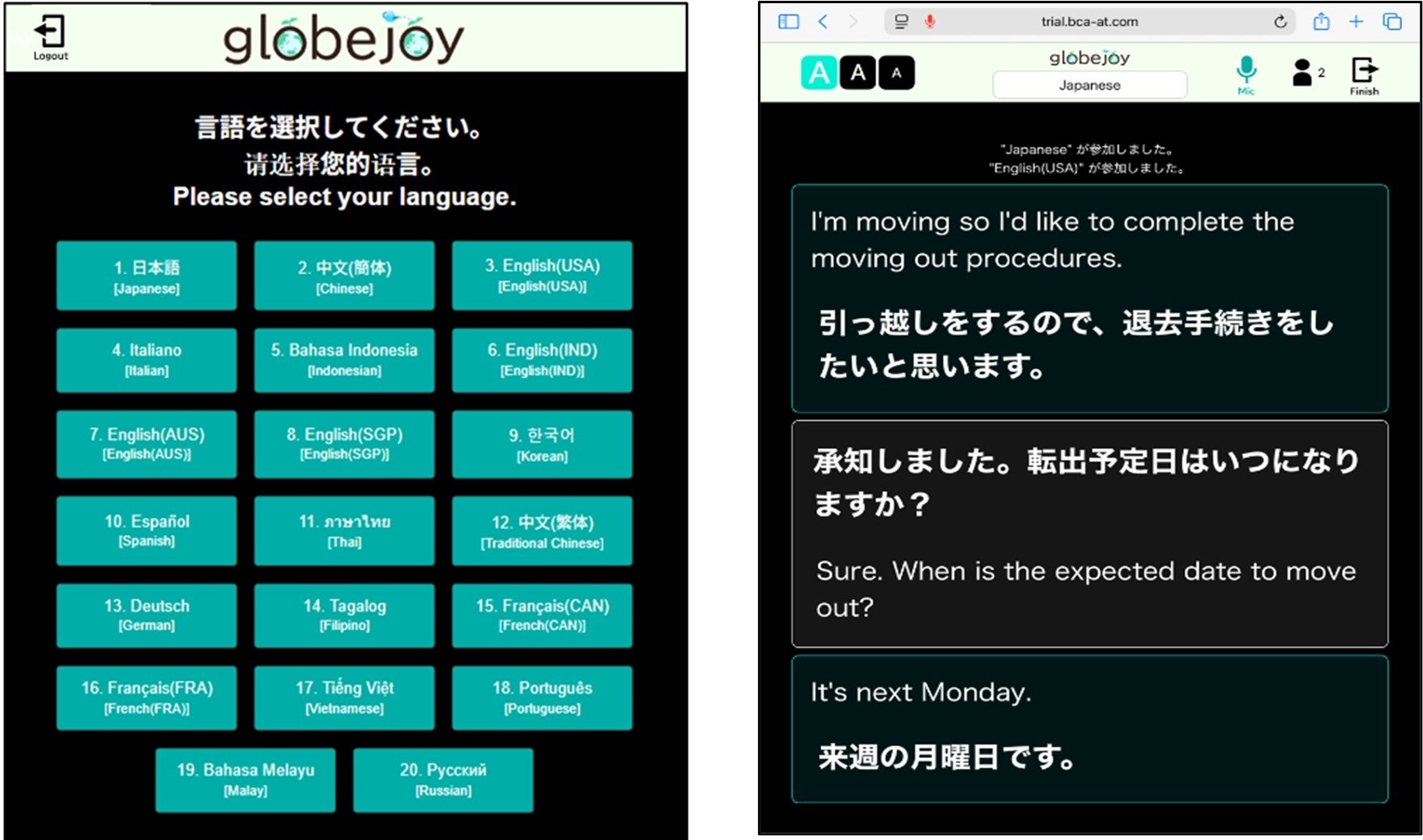このような状況を踏まえ、NTT-ATは、自治体での窓口対応やホテルなどの接客対応時における言葉の壁を取払い、外国人とのコミュニケーション上の課題解決を実現するため「globejoy」の対面版を提供することとしました。