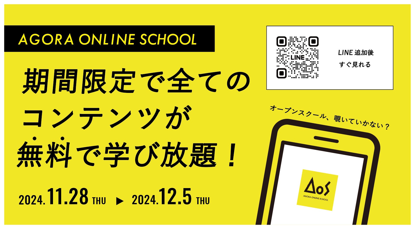 カフェや居酒屋など、飲食店を経営する株式会社キープ・ウィルダイニンググループ会社であり、都内でコワーキングスペースを展開し創業支援を推進する、株式会社AGORA(読み:アゴラ、本社:東京都町田市、代表:長谷部 信樹)は、起業を身近にするオンラインスクール「AGORA ONLINE SCHOOL(以下AOS、読み:エーオーエス)」の本格提供をスタート後、初めてのお得なキャンペーンを実施いたします。